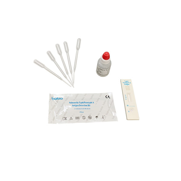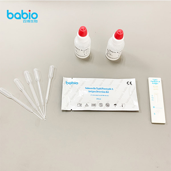抗体/金コロイド色素複合体および固相上に固定化されたポリクローナル抗体。これにより、腸チフスに関連するチフス菌-パラチフス抗原が高い感度と特異性で選択的に同定されます。
